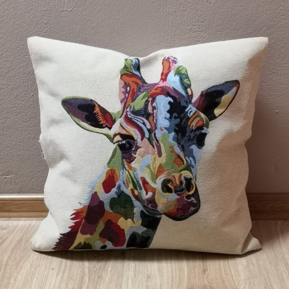 Natúr, ekrü alapon színes zsiráfos mintával szövött párna huzat. Nagyon jól mutat az elefántos huzatunkkal.